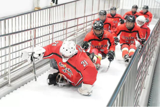 残奥冰球运动员使用冰橇比赛,视线比冰球运动员低,运动员席和受罚席需要替换为透明界墙。透明界墙采用了高密度聚乙烯板,既能保护运动员,又便于他们随时观察场上局势,随时做好上场准备。由于冰橇对冰面形成的冲击更大,因此需要增加赛场冰面的厚度。运动员席和受罚席都要改造,铺上一层冰面方便坐着冰橇的运动员自由进出。