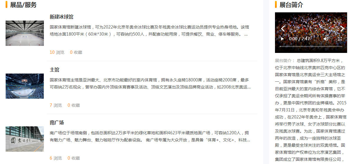 点击进入国家体育馆的云展厅,可以看到展厅分为场馆图片展示、场地视频展示、场馆简介、服务展示等几个主要部分,通过文字、视频和图片的形式集中展示了国家体育馆的主馆、冰球馆、副馆、南广场等几个核心板块内容,观众可以自由浏览查看展品和文字介绍,带来身临场馆的感受。