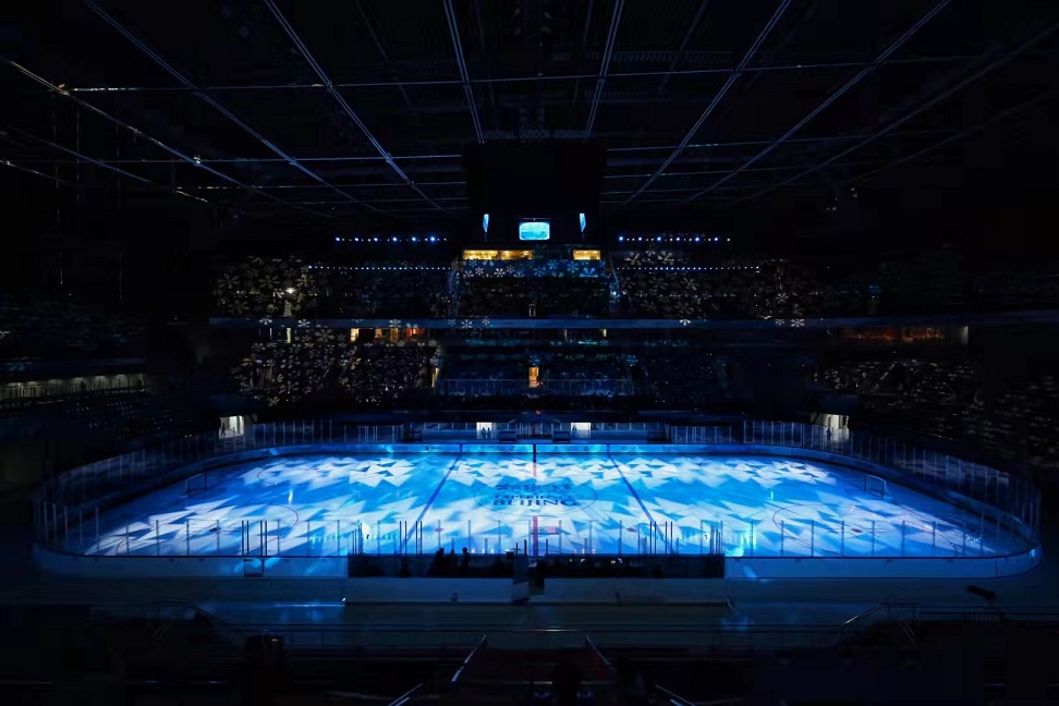 11月10日晚21点10分,随着全场灯光变暗、动感热烈的音乐响起,洁白的冰面变为灯光画布,“相约北京”的中英文标识衬着蓝色背景浮现在眼前,结合震撼的音响效果,一场美轮美奂的灯光秀在国家体育馆竞赛场地拉开帷幕——国家体育馆迎来了“相约北京”冰球国内测试活动的首赛!比赛由北京首钢队对阵中国冰上运动学院队,这也是第一阶段比赛的最后一场。