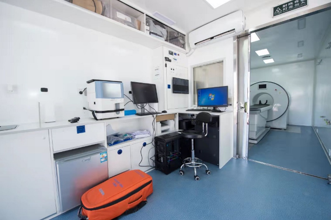 在这个车上,呼吸机、血常规、心电监护仪、心脏复苏机、恒温冰箱、新风系统、紫外线消杀设施等设备应有尽有,可以说既有检验科,也有影像科,几乎就是一个微型医院,这样设施齐全的移动CT车在国内还是首辆。