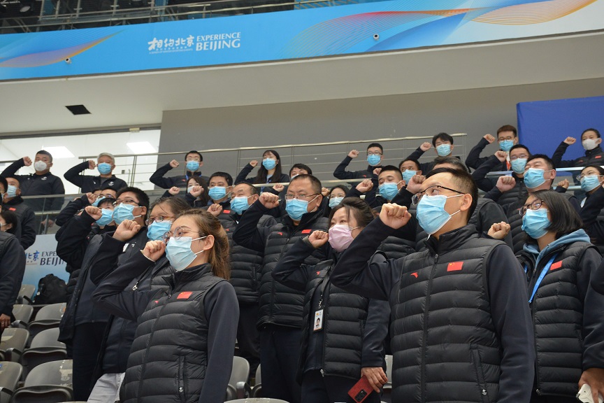 “我宣誓:不忘初心,牢记使命;不负重托,攻坚克难;以战则必胜的信心、决心,为实现冬奥测试目标努力奋进!”会议现场,场馆运行团队全体工作人员奏唱国歌,观看了国家体育馆“冰之帆”的备战视频,并庄严宣誓。