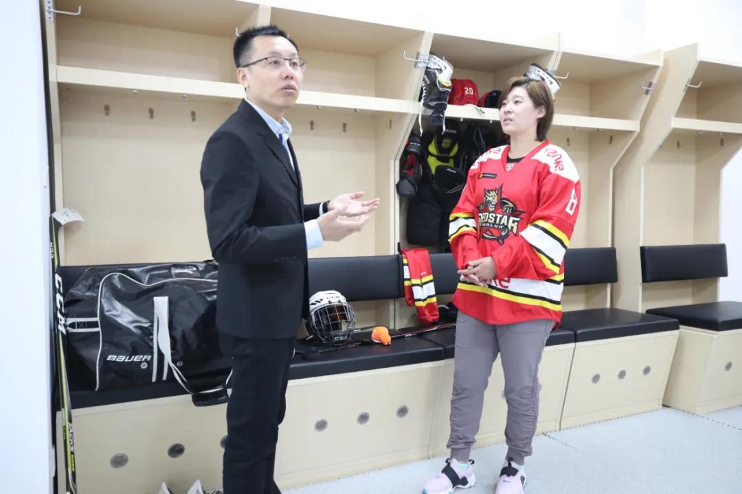 最后,姜娜与王总经理一同上冰,体验了国家体育馆顶级的奥运会级别的冰面质感。姜娜为大家讲解冰球护具的穿搭与冰鞋分类知识,还展现了多项冰球技术与单刀破门表演,将直播推向高潮!